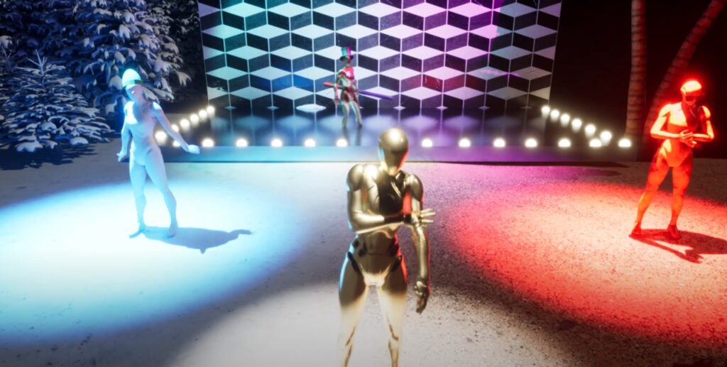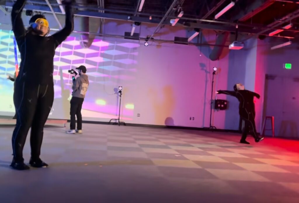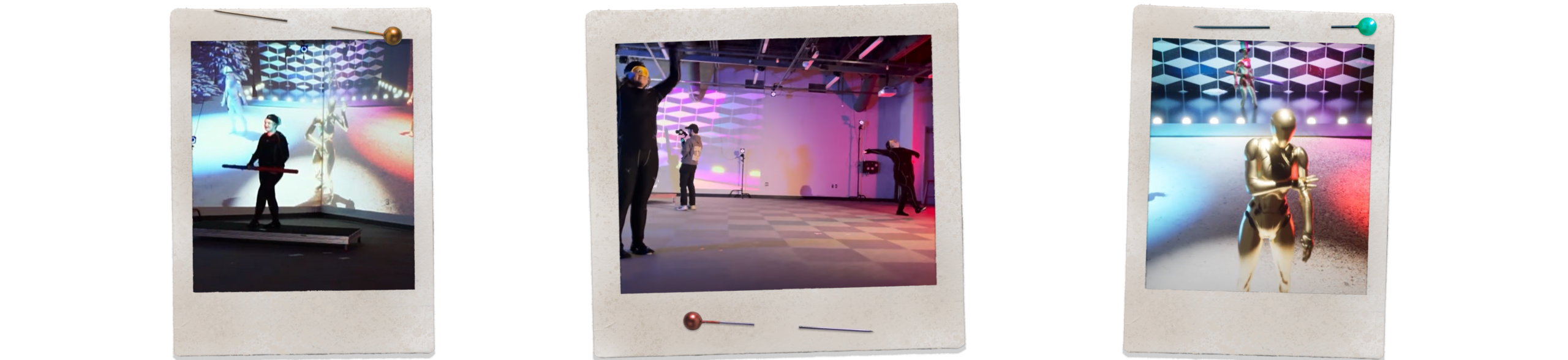 The concept of the game was a riff on games like “Simon Says”. The audience was divided into two halves as either the “Hot” team or the “Cold” team. Myself and Alexah Fort were costumed in motion capture suits to perform as the “Cold” and “Hot” avatars respectively. We were blindfolded and verbally directed by the live audience to copy a randomized pose of our assigned avatars on screen. Rain Sidwell played the Game Host (also in a motion capture suit) and would decide which team copied the pose the best after which Rori Johnson would assign the points at her station at the computer. I was in charge of the programming of this game within Unreal Engine. I worked with Unreal Blueprints to create the mechanism that allowed the avatars to follow our live movements for some of the time and freeze on a randomized, pre-captured pose for the challenge parts of the game. I also programmed keys to switch between various virtual camera angles so that Rori Johnson could control the view of the performance in real time. This project allowed us to explore how motion capture can be used to bring people together through play and audience interaction.